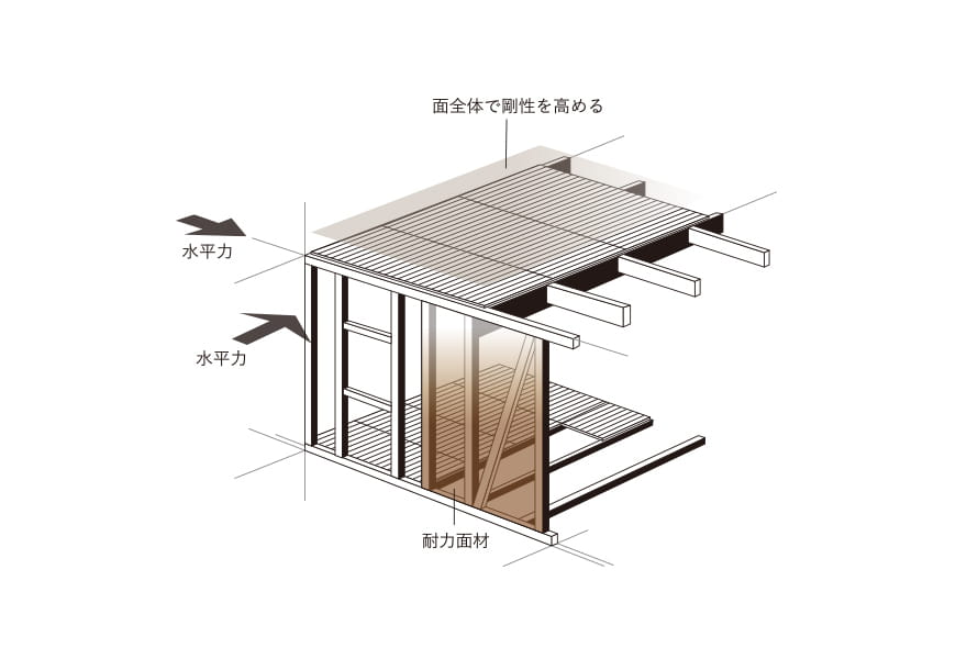 さらに、耐力面材を使って家全体を“面”で支える構造にしているので、