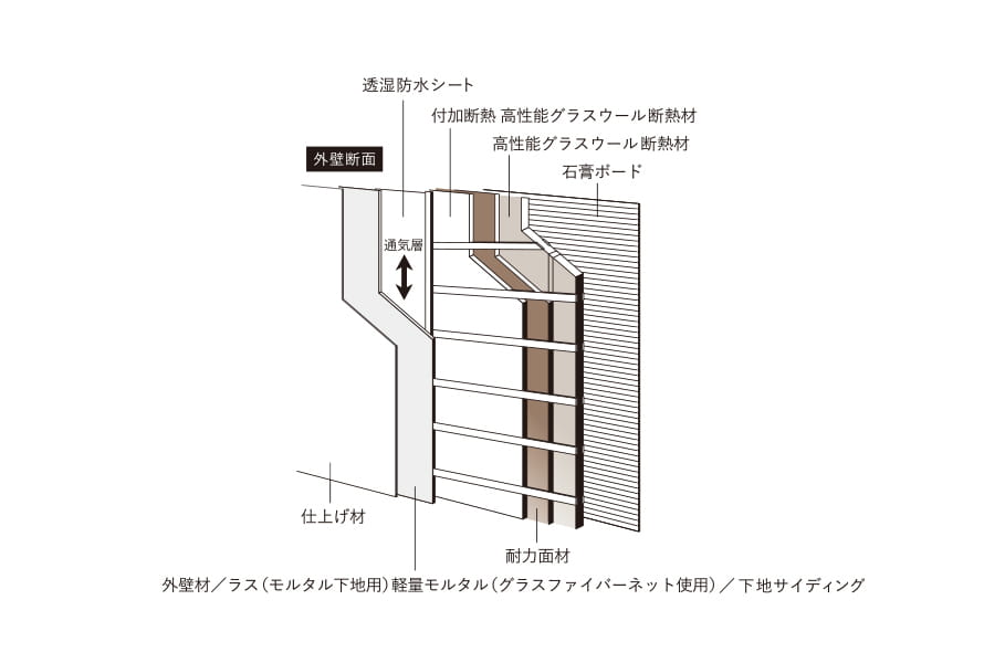 壁の中と外、二重の断熱材で包み込む“付加断熱工法”を採用。