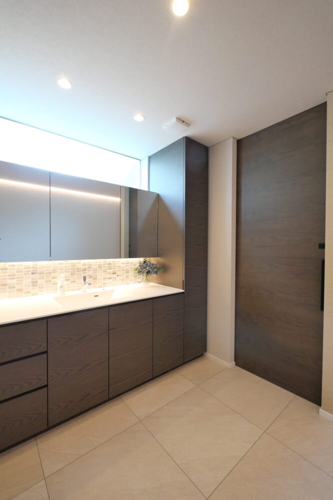 洗面化粧台も造作いたしました。こちらにもガラスのモザイクタイルを採用。