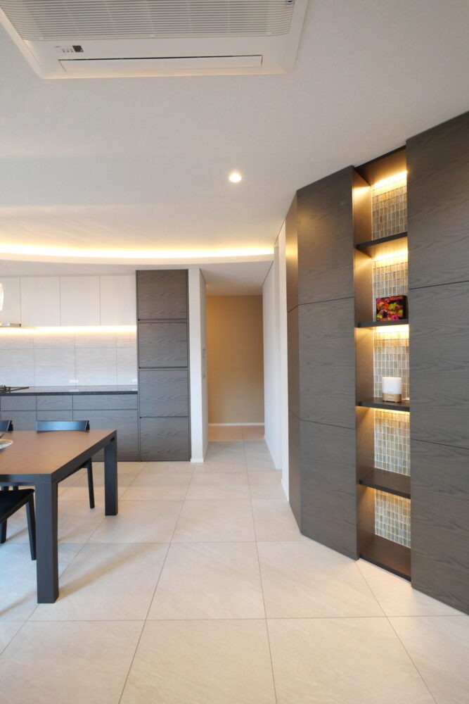 キッチン横の壁にはこだわりの飾り棚を造作。