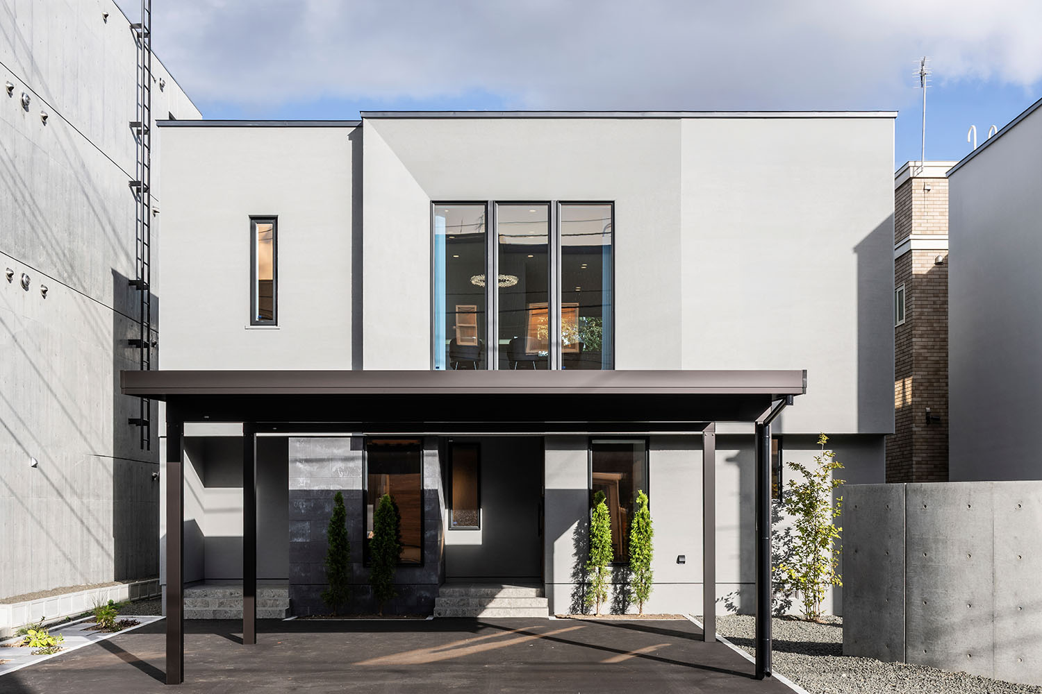 閑静な住宅街の角地に完成した窓が印象的な邸宅です。東側の公園の緑を借景として生かし、大胆なカーテンウォールと吹き抜けで開放感を演出。南側には視線を遮る目隠しバルコニーを配置し、プライベート感を確保しました。外からの目を気にすることなく、ダイニングでゆったりとした時間を過ごせます。キッチンはオーダーメイドで、パンやピザの生地をこねる作業にも対応できるよう、クォーツサイトの広々とした天板を採用。高さもお施主様に合わせた設計で、使いやすさと美しさを兼ね備えた空間を実現しました。