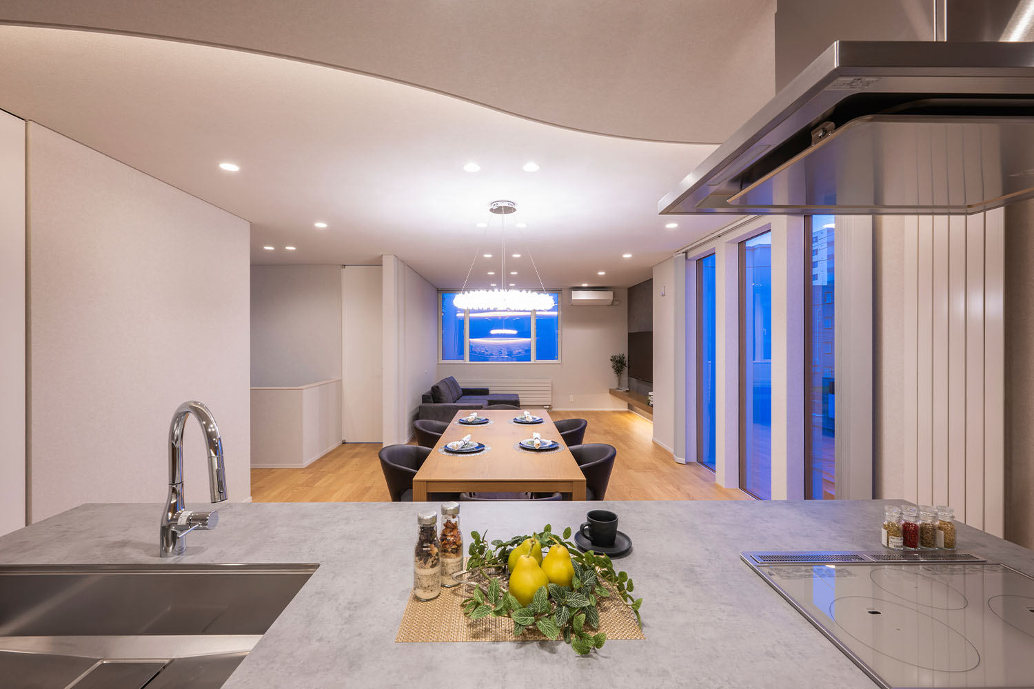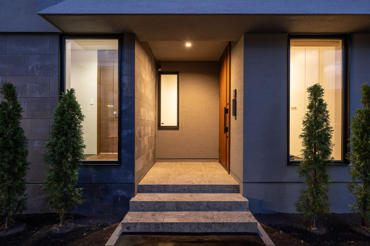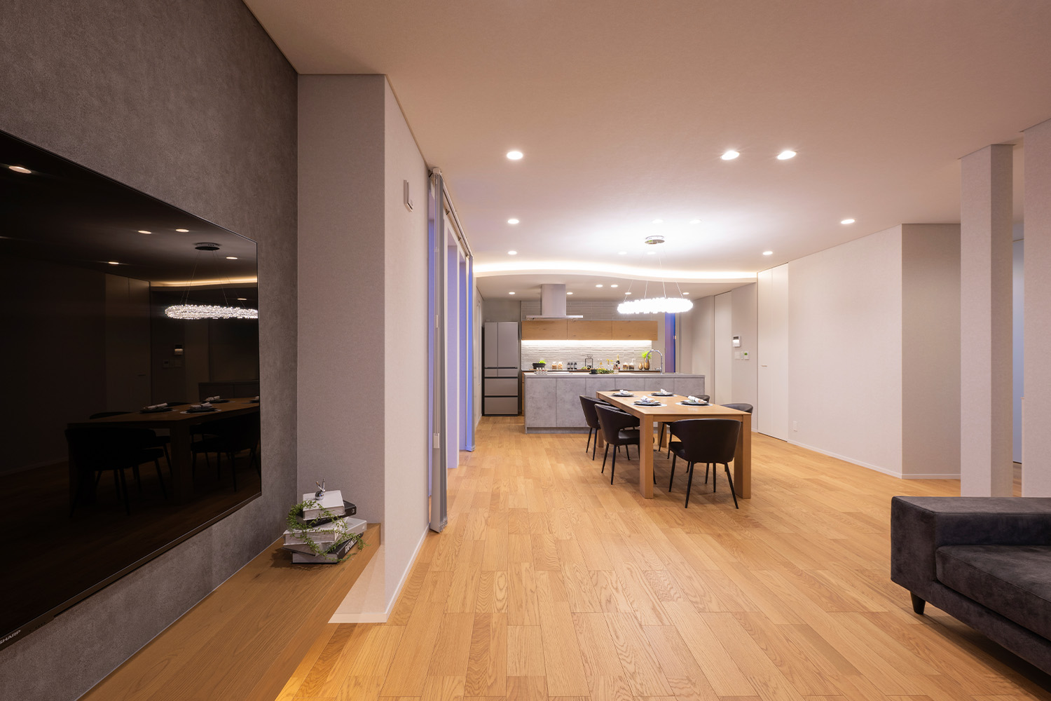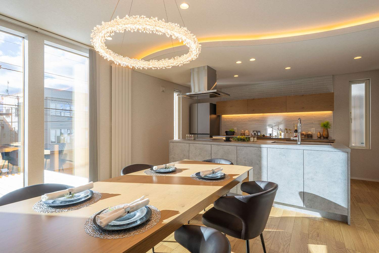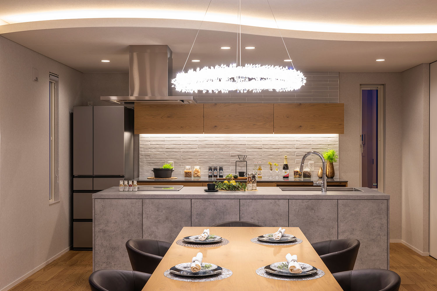 外観はグレーでそろえながらも、正面は塗り壁、残り3方はSGL採用しエッジを効かせた個性的な佇まいの邸宅です。ピアノのレッスンルームを備えた室内もメインカラーをグレーで統一し、シックな雰囲気を演出しました。ご家族が集う2階LDKは、約27帖広さと特大のピクチャーウィンドウがもたらす開放感に満ちた空間。天然木の風合いと豊かな表情を感じることができる銘木フロアを採用し、壁紙は、自然な石の質感をリアルに再現したモダンな石目調のハードストレッチタイプを使っています。こだわりのキッチンはGRAFTEKT製。天井まで這わせたボーダーの石面調タイルが印象的です。カップボードやダイニングテーブルは、ナラ材で造作し、一体感のある空間に仕上げました。