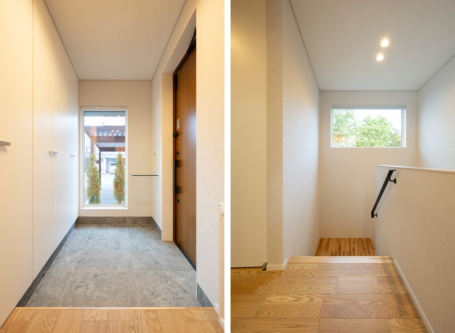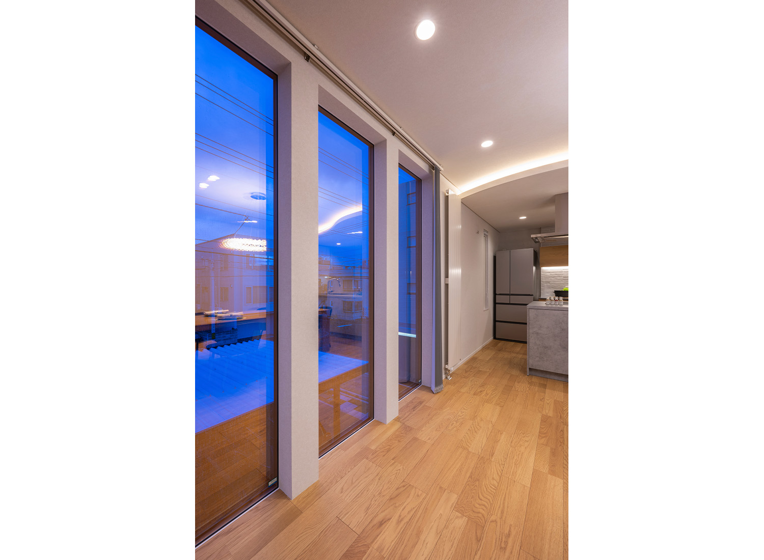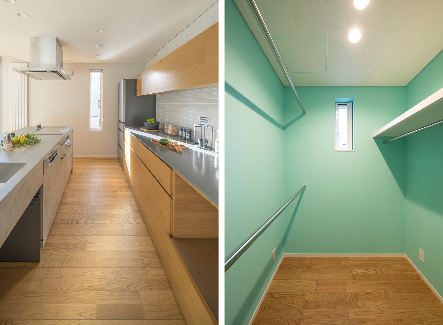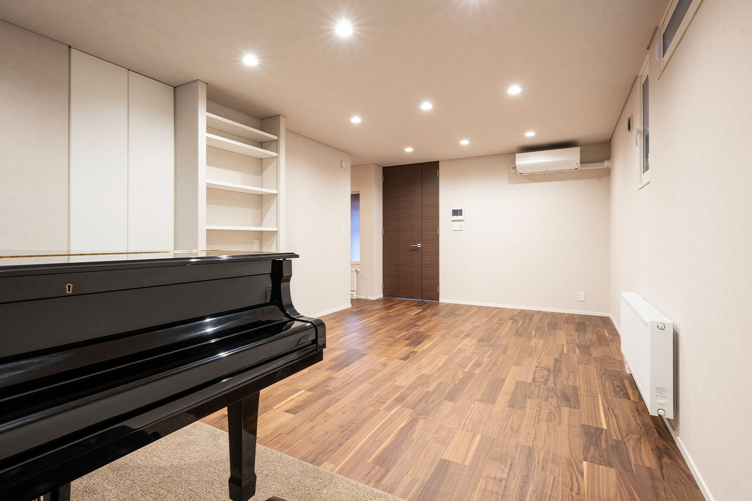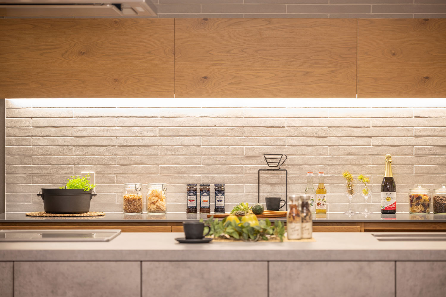 外観はグレーでそろえながらも、正面は塗り壁、残り3方はSGL採用しエッジを効かせた個性的な佇まいの邸宅です。ピアノのレッスンルームを備えた室内もメインカラーをグレーで統一し、シックな雰囲気を演出しました。ご家族が集う2階LDKは、約27帖広さと特大のピクチャーウィンドウがもたらす開放感に満ちた空間。天然木の風合いと豊かな表情を感じることができる銘木フロアを採用し、壁紙は、自然な石の質感をリアルに再現したモダンな石目調のハードストレッチタイプを使っています。こだわりのキッチンはGRAFTEKT製。天井まで這わせたボーダーの石面調タイルが印象的です。カップボードやダイニングテーブルは、ナラ材で造作し、一体感のある空間に仕上げました。